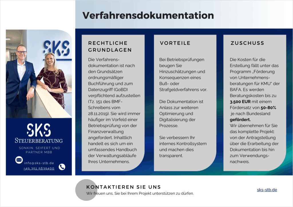 Die Erstellung oder Aktualisierung einer Verfahrensdokumentation kann für kleine und mittlere Unternehmen (KMU) durch einen Zuschuss der BAFA (Bundesamt für Wirtschaft und Ausfuhrkontrolle) gefördert werden.