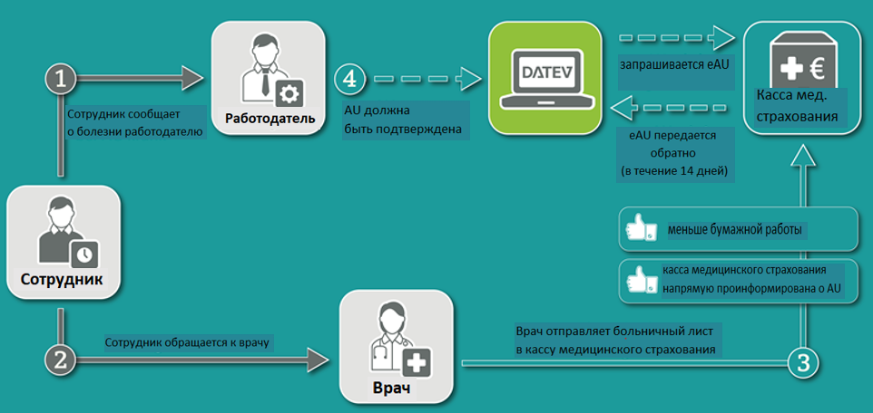 Співробітник звертається до лікаря. Лікар передає дані довідки про непрацездатність в електронному вигляді в касу медичного страхування. Роботодавець повинен запросити дані в електронному вигляді. Довідка про непрацездатність у паперовому вигляді більше не видаватиметься. Тільки співробітник отримуватиме паперову копію для своєї документації. Однак ваші співробітники все одно зобов’язані негайно повідомити вас про свою непрацездатність та її передбачувану тривалість.