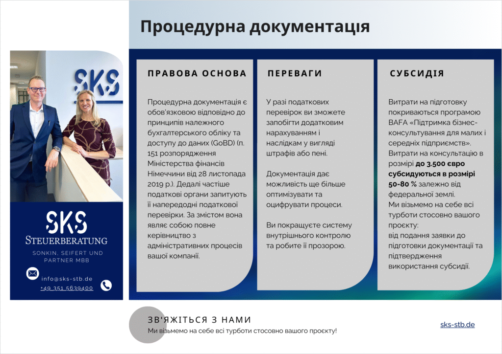 • Підготовка повної процедурної документації відповідно до вимог GoBD.